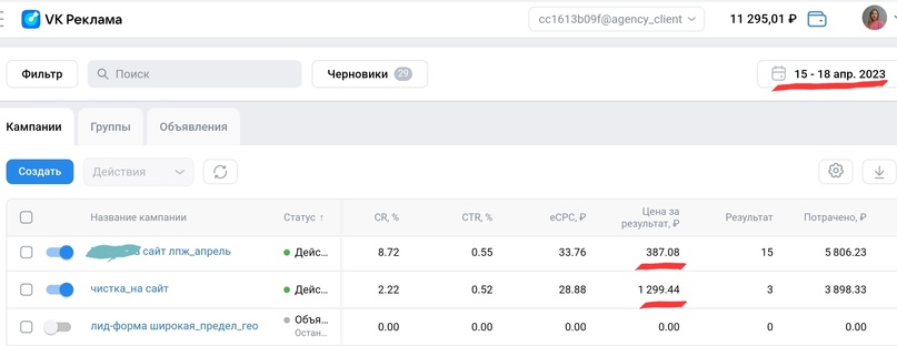 В апреле также продолжаю работать паралельно со старым кабинетом с трафиком на группу вконтатке и новым кабинетом, но уже с трафиком на лендинги. Промеждуточные результаты радуют.